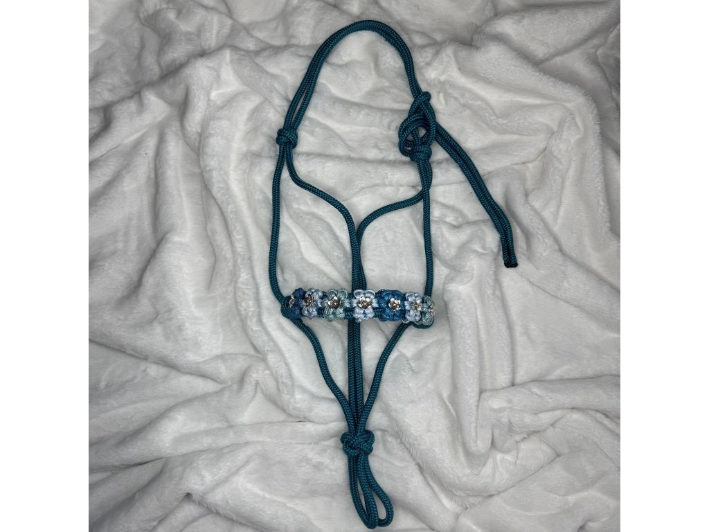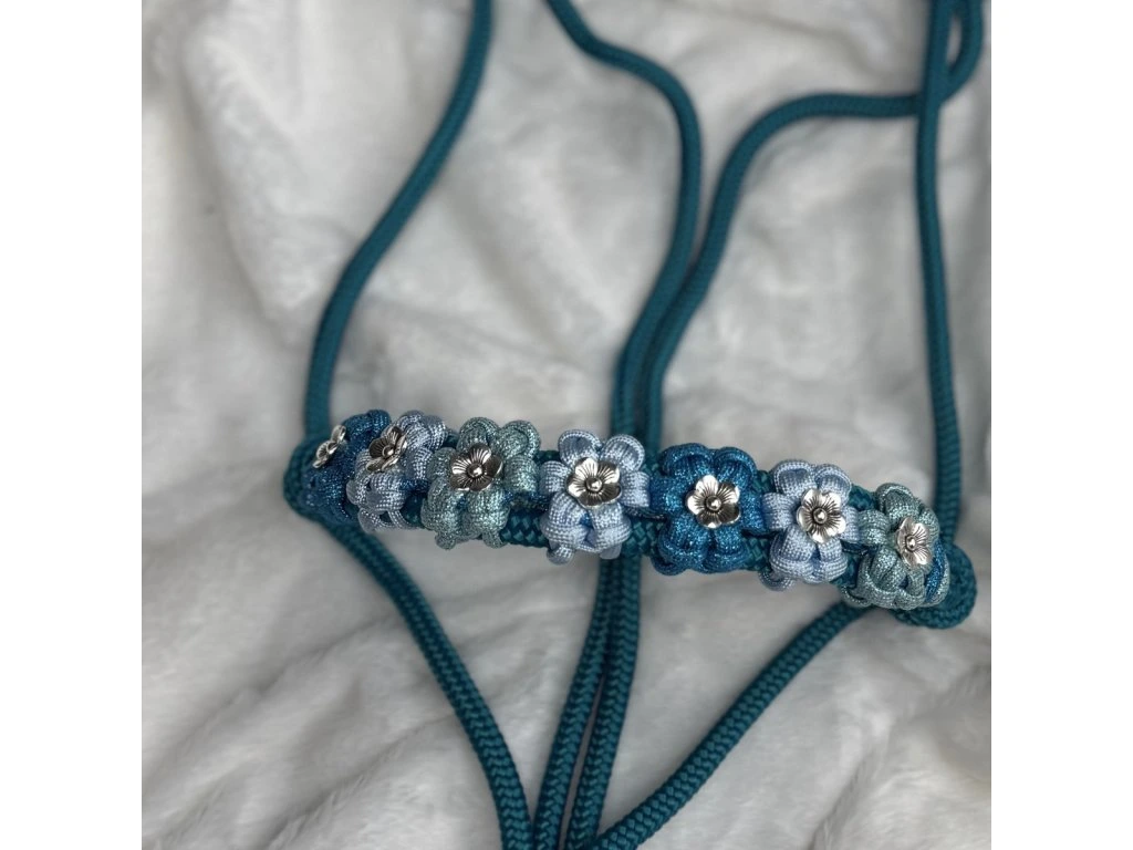 Jedinečná ručne vyrábaná parelová ohlávka pre koňa vo farbe Aqua s kvetinovým vzorom. Doprajte svojmu koňovi výnimočný doplnok, ktorý vyniká originalitou a precíznym spracovaním. Táto ručne vyrábaná ohlávka je výsledkom poctivej práce a dôrazu na každý detail.