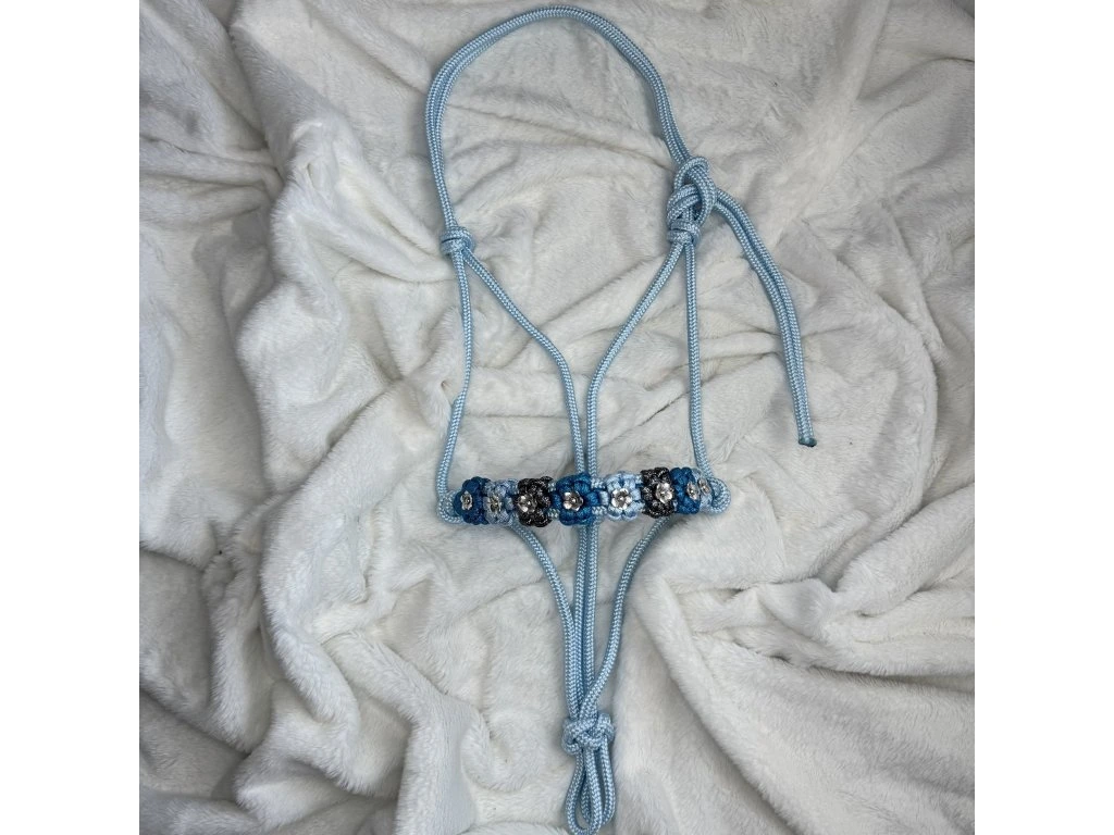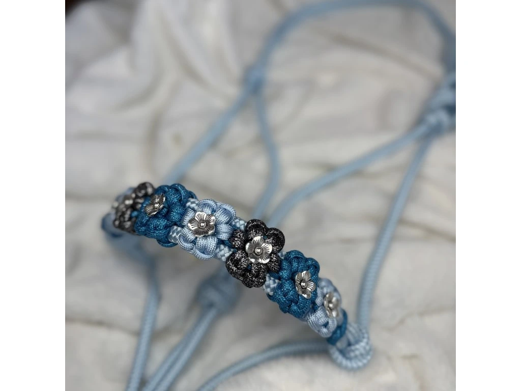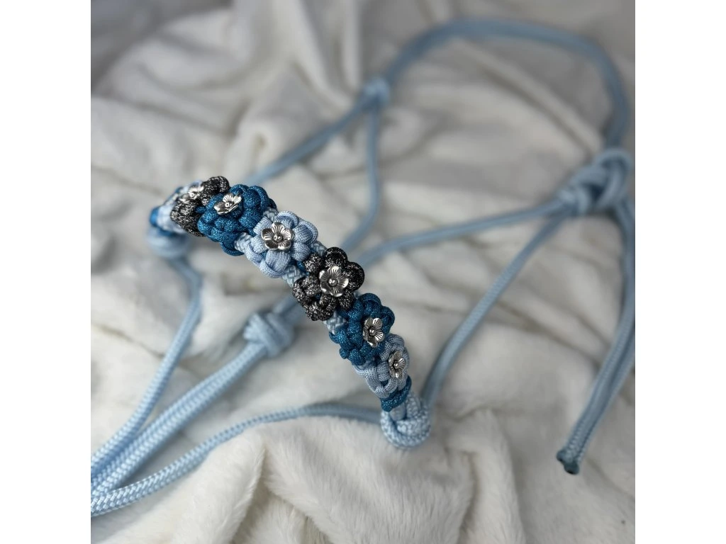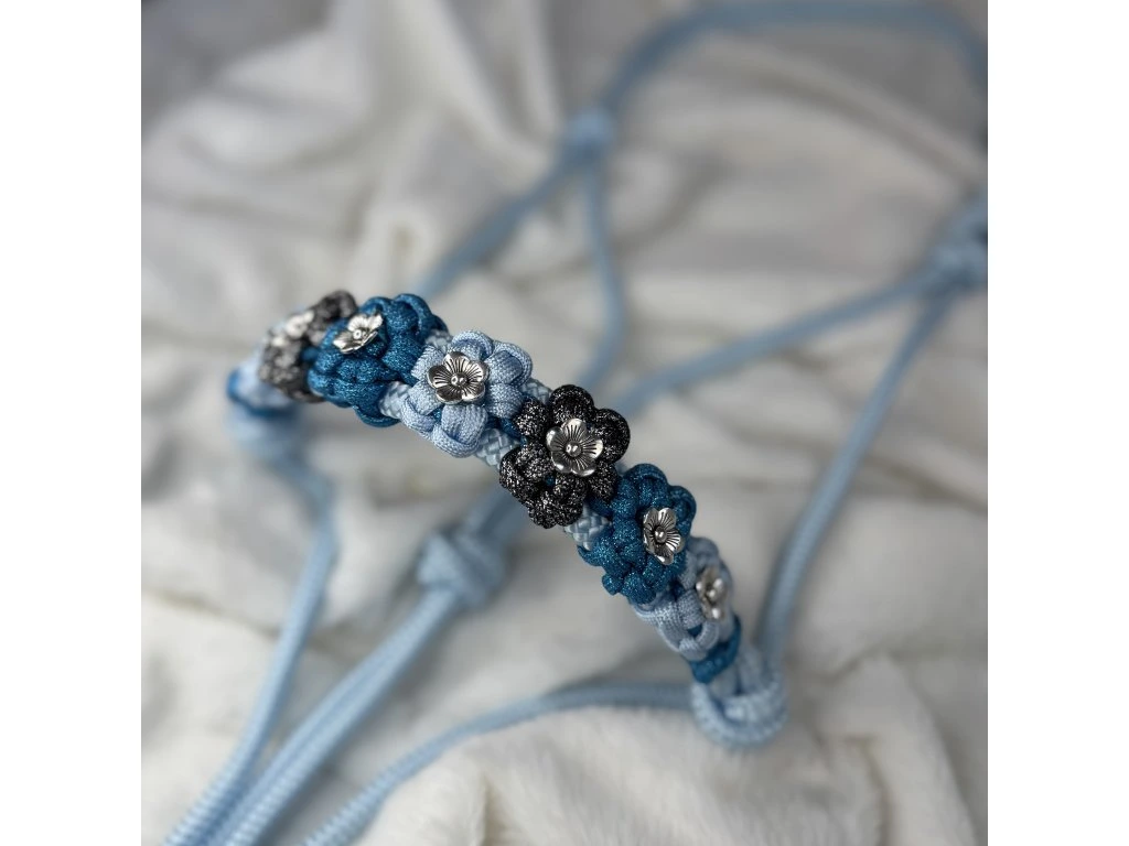 Jedinečná ručne vyrábaná parelová ohlávka pre koňa vo farbe Baby blue s kvetinovým vzorom. Doprajte svojmu koňovi výnimočný doplnok, ktorý vyniká originalitou a precíznym spracovaním. Táto ručne vyrábaná ohlávka je výsledkom poctivej práce a dôrazu na každý detail.