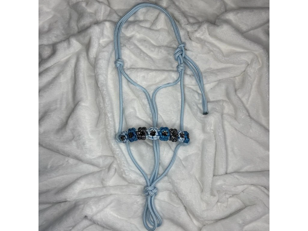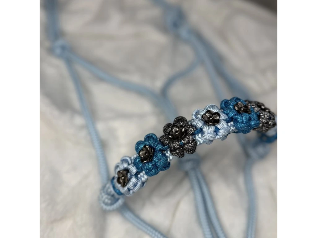 Jedinečná ručne vyrábaná parelová ohlávka pre koňa vo farbe Baby blue s kvetinovým vzorom. Doprajte svojmu koňovi výnimočný doplnok, ktorý vyniká originalitou a precíznym spracovaním. Táto ručne vyrábaná ohlávka je výsledkom poctivej práce a dôrazu na každý detail.