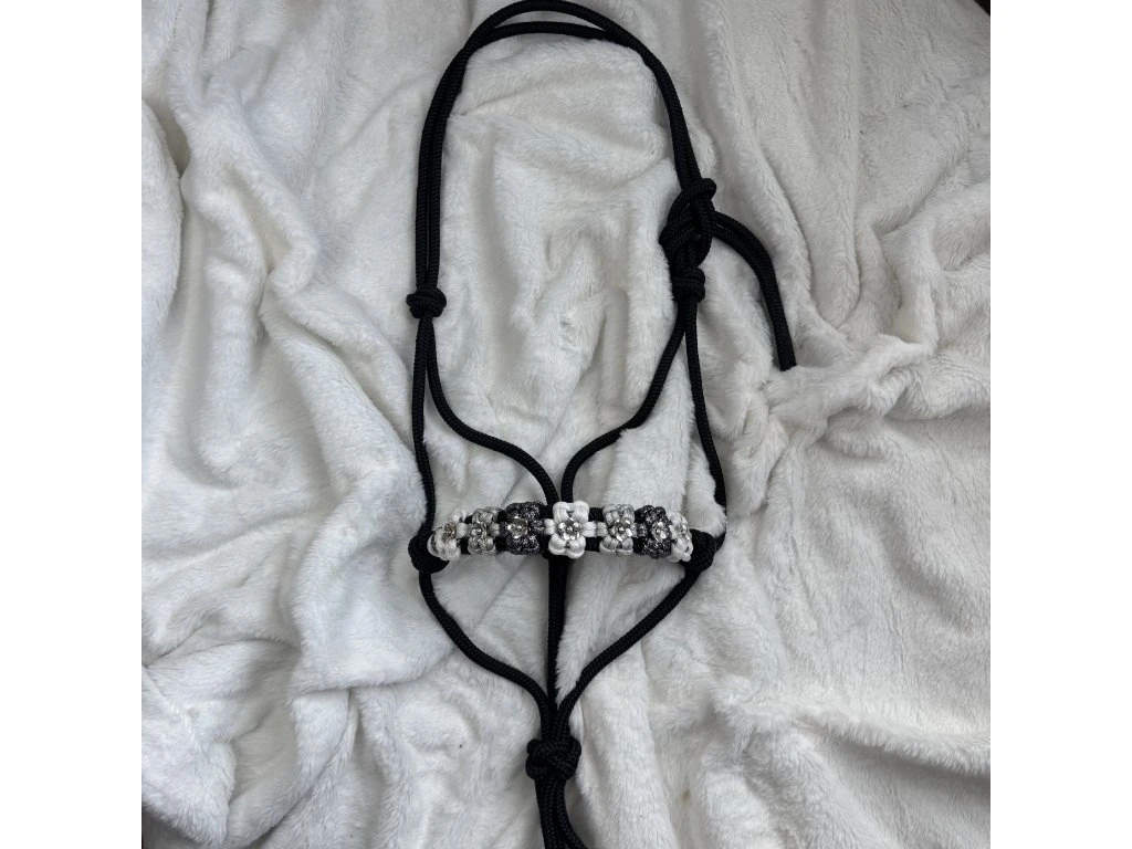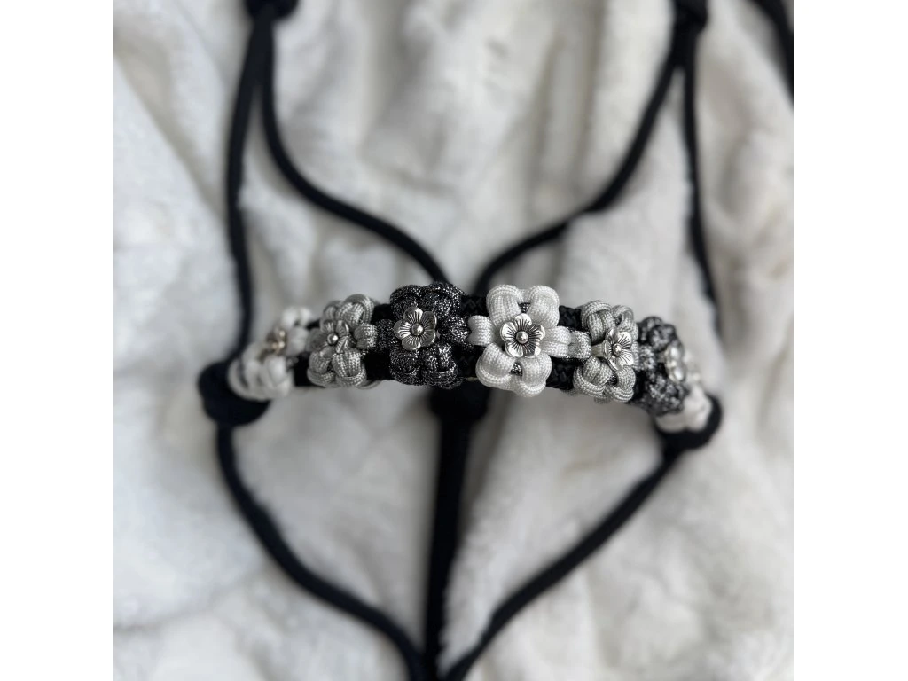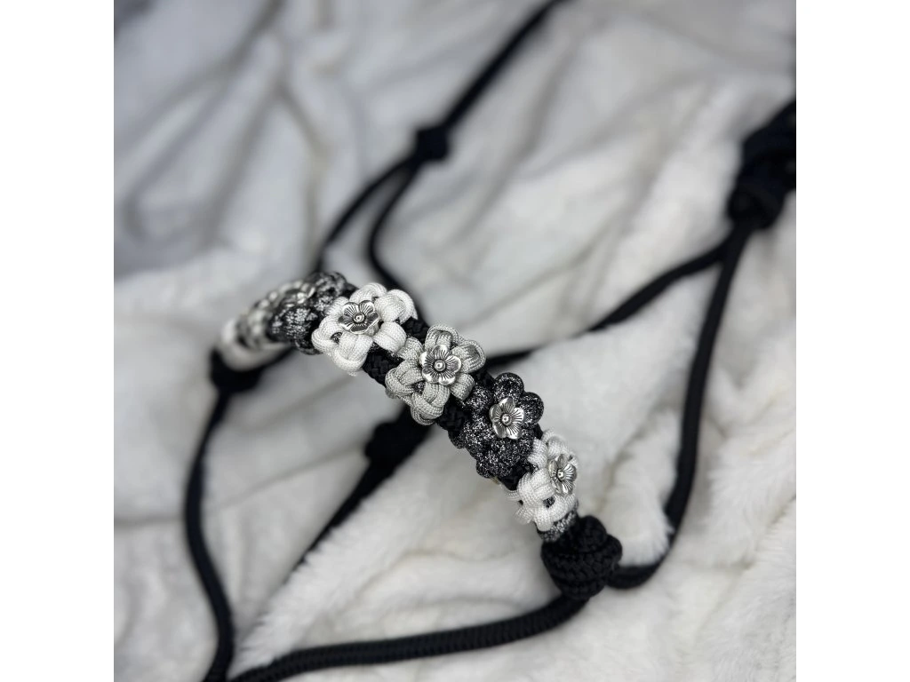 Jedinečná ručne vyrábaná parelová ohlávka pre koňa vo farbe Black s kvetinovým vzorom. Doprajte svojmu koňovi výnimočný doplnok, ktorý vyniká originalitou a precíznym spracovaním. Táto ručne vyrábaná ohlávka je výsledkom poctivej práce a dôrazu na každý detail.